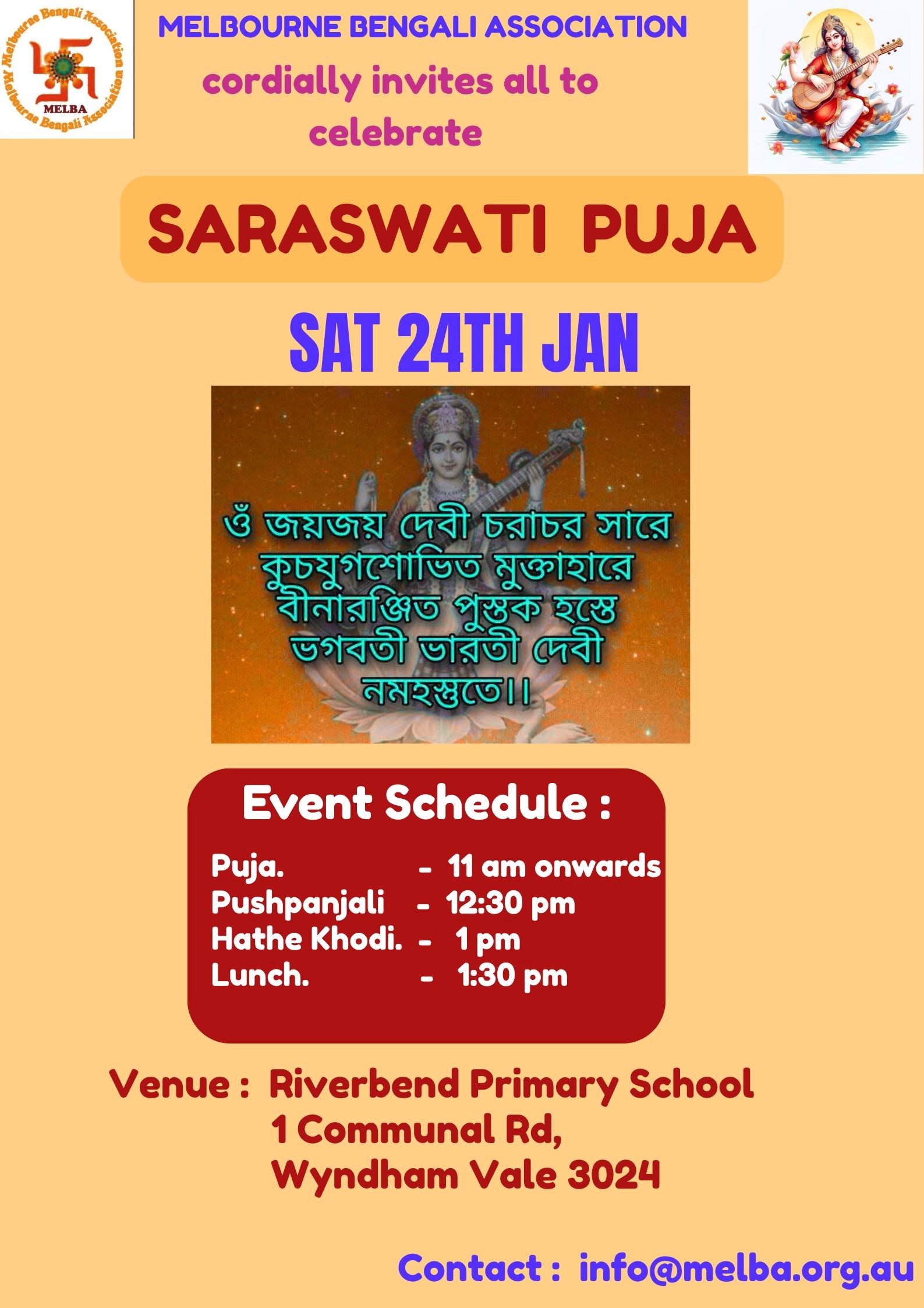 Saraswati Puja 2026Melbourne Bengali Association cordially invites all to celebrate “SARASWATI PUJA 2026”. Details are as below Date: Saturday, 24th January Place: Riverbend Primary School , 1 Communal Rd, Wyndham Vale,3024 Kindly confirm your attendance by sending RSVP to info@melba.org.au Happy Saraswati Puja |
